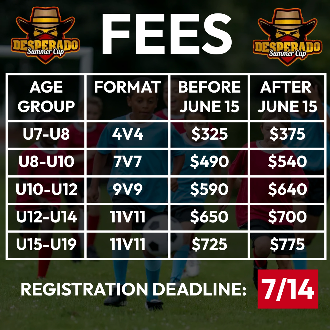 U12-U14 (11v11): $700 before 6/15, $750 after 6/15
